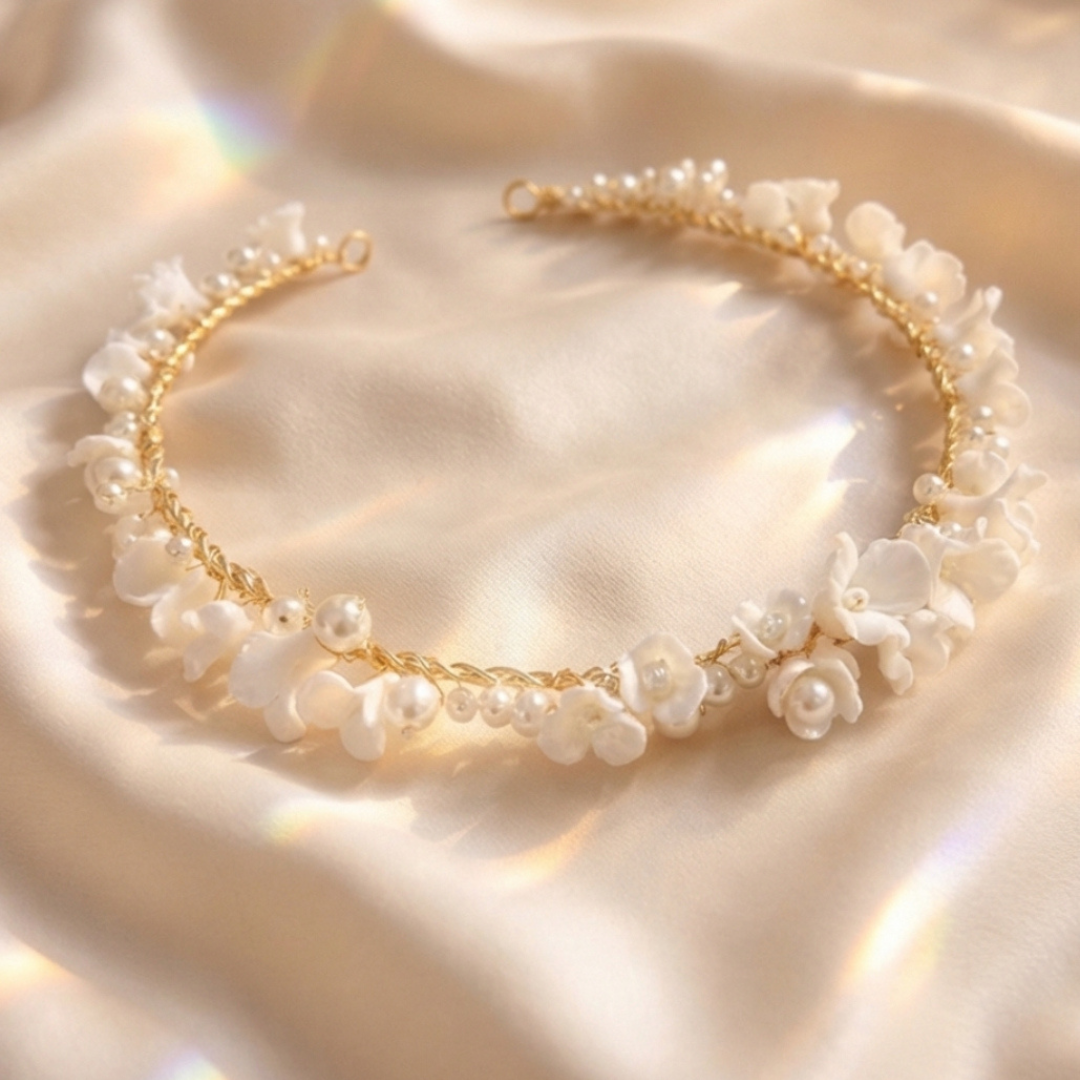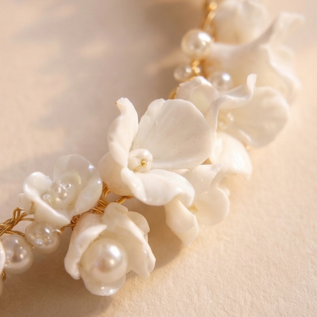 A delicate bridal halo hair accessory featuring white ceramic flowers and elegant pearl details. This lightweight and flexible piece is designed to sit comfortably in the hair and can be styled as a halo, woven into braids, or placed around an updo.